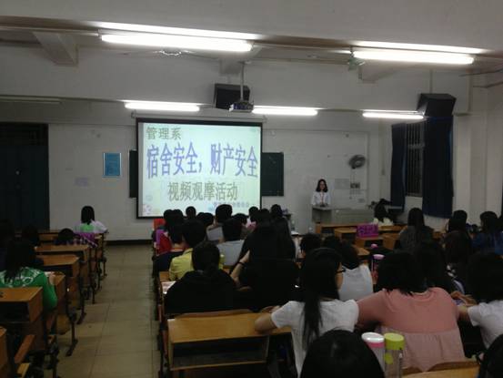 本系讯(通讯员:王珊珊)2014年4月10号晚8:00,由管理系宿舍委员会主办的“宿舍安全.财产安全”视频观摩活动在四栋101教室成功举办。出席本次活动的嘉宾有学保部保卫科科长杨志亮,学生公寓中心主任莫永坚,管理系党总支书记杨晓文,管理系办公室主任钟清恒,管理系团总支书记钟劲,管理系办公室辅导员陈玲娟,崔运玲,林成园,秦文飞,王翔,张方超。与会人员还有各班级学生代表。
