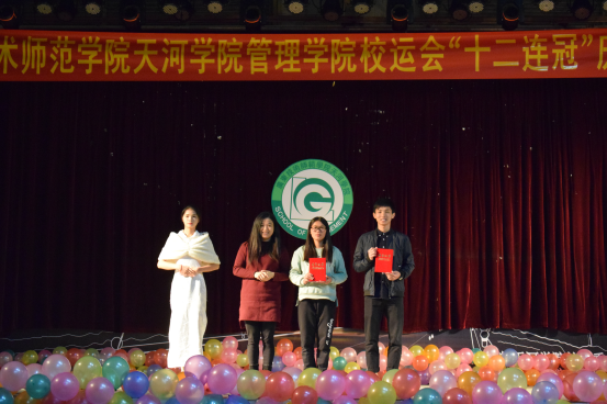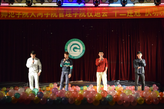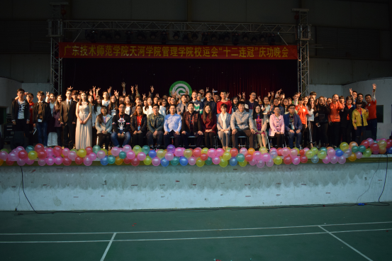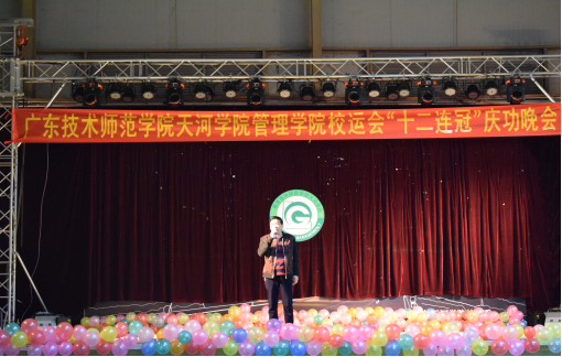 12月8日晚,威廉希尔williamhill中文校运会“十二连冠”庆功晚会在体育馆举行,出席晚会的嘉宾有管理学院学院党总支书记易国富,办公室主任肖柳,团总支书记黄伟剑,辅导员黄浩、陈玲娟、伍小英,办公室老师赵竹君,运动员代表、啦啦队和彩旗队队员、团总支·学生会全体成员以及各校院代表。