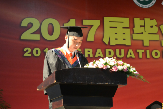 毕业生代表李锦栋发言,表达了对领导、老师致以衷心的感谢和对同学表示衷心的祝贺和诚挚的祝福,接着,他回忆了大一的纯真时代、大二的轻舞飞扬、大三的紧张忙碌、大四的艰苦奋斗,讲述了老师对他的帮助和同学的热情友爱,同时,他承诺毕业生们在未来仍会秉承“学用心智、行知诚明”,运用所学知识,勤于实践、踏实做事,为母校争光添彩,以回报社会,回报母校,最后表达了对领导老师以及同学的美好祝愿。