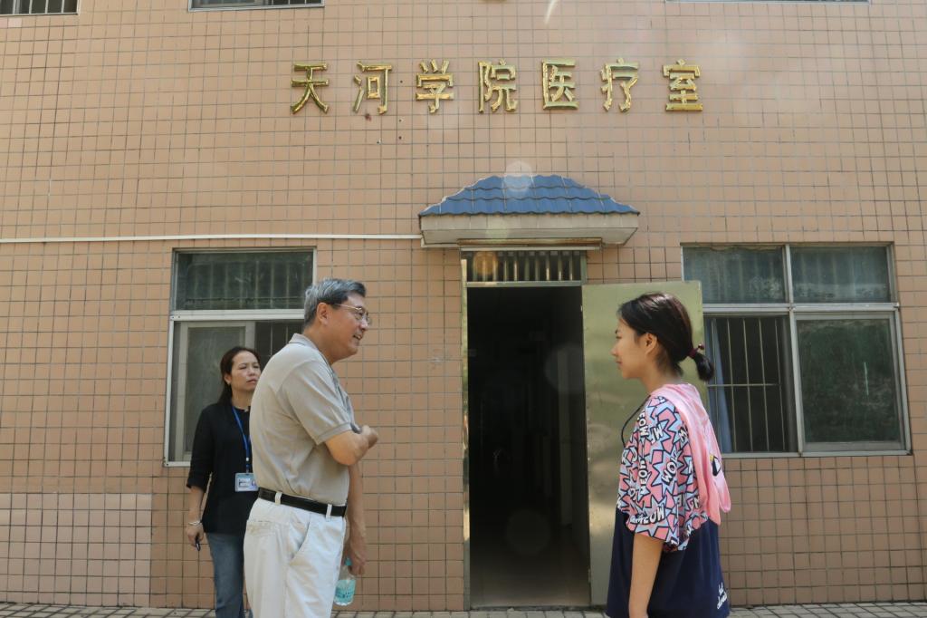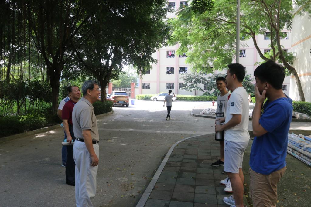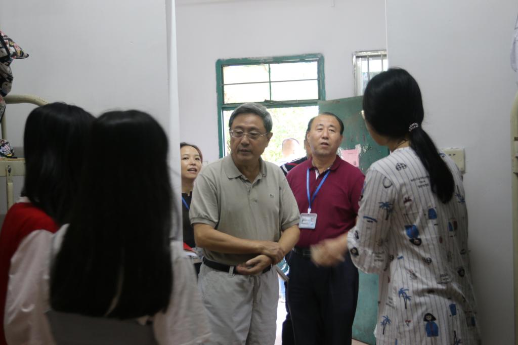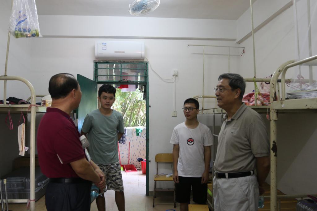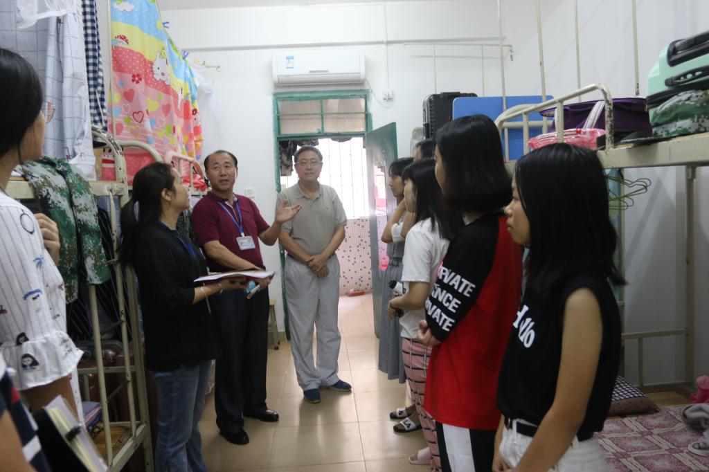 9月9日,星期日。胡社军校长和肖海副书记走进学生宿舍区,检查住宿、饮食、卫生、医疗、运动场所,探访大一新同学和家长,走访部分老生宿舍。