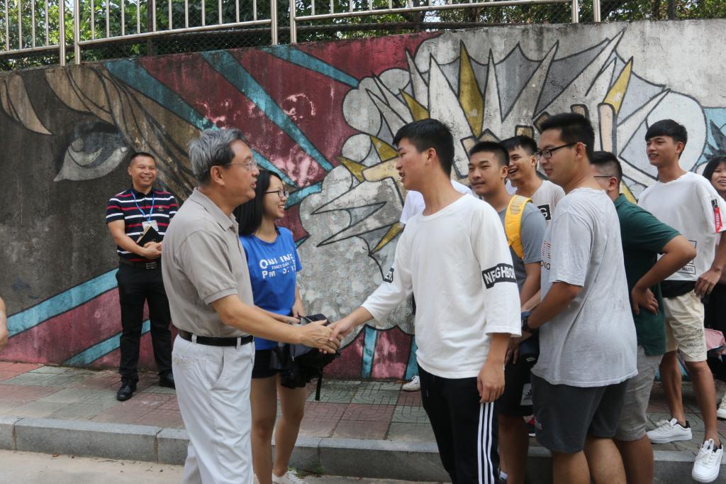 在林荫道上,领导们遇到了机电学院在助理班主任带领下熟悉校园的新同学,当有同学自我介绍来自云南时、是傣族时,胡校长和肖副书记很高兴,笑称有朋自远方来,一家亲还要一家勤,勤学习、勤工作,勤奋才能学到真本领。