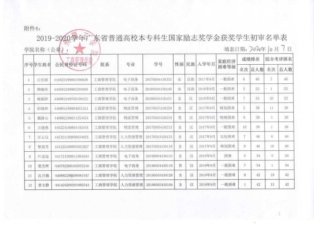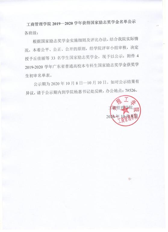 根据国家励志奖学金实施细则及评比办法,结合威廉希尔williamhill中文实际情况,本着公平、公正、公开的原则,经学院评审小组审核,决定授予丘佳丽等33名学生国家励志奖学金,现予以公示:附件4 2019-2020学年广东省普通高校本专科生国家励志奖学金获奖学生初审名单表。