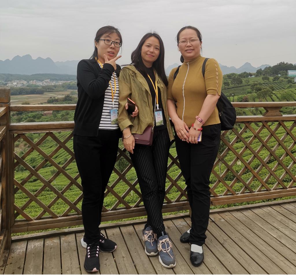 | 从右至左:李美珍副院长、杨惠书记、刘琰老师参观茶山 |