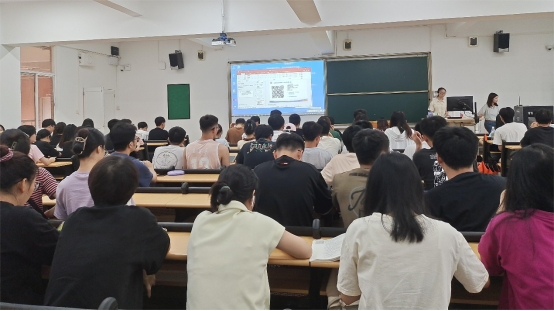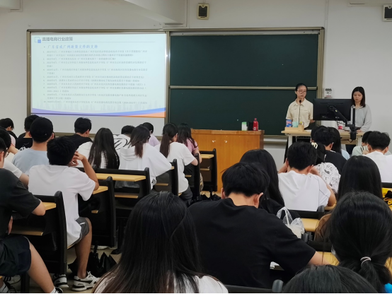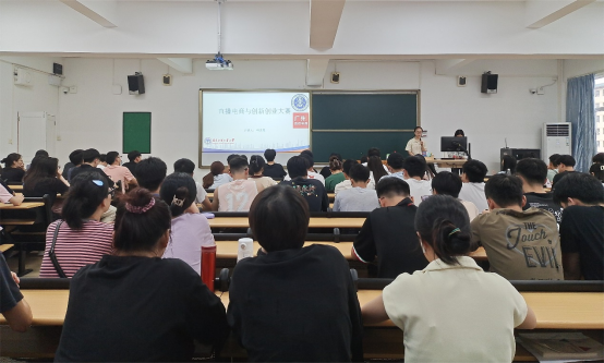 冯女士从“直播电商发展现状与趋势、行业岗位及薪资情况、直播电商行业政策”三方面向同学们介绍了直播电商行业,阐述了直播与短视频行业的蓬勃发展,指出了当下直播电商行业呈上升趋势且就业前景广阔。冯女士介绍了2023年直播电商创新创业大赛。她指出此次大赛以“激活湾区创新创业热潮,赋能湾区产业高质量发展”为主题,旨在为高校学生提供更多就业机会,助力高校应届毕业生创业就业。冯女士从参赛形式、赛制安排、直播培训、奖励机制等方面继续向同学们讲述大赛相关内容,在座同学仔细聆听、认真记录。