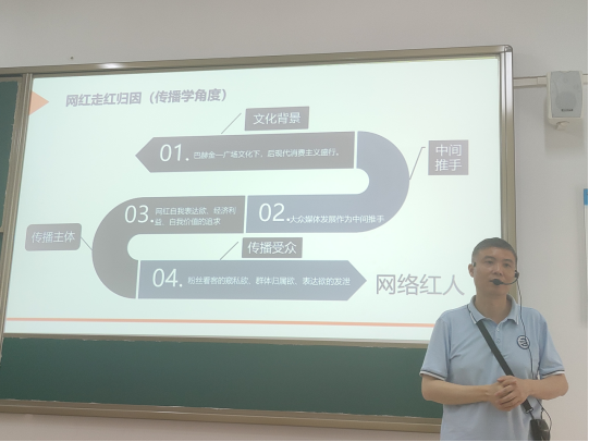 老师还从传播学和营销学的角度解说网红走红的原因。当下后现代消费主义盛行的文化背景、媒体作中间推手、传播主体网红、传播受众共同推动了文化走红。