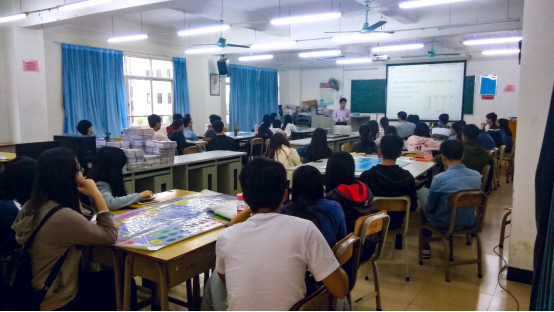 (通讯员  张三林)4月14日下午,由ERP学术社主办的ERP企业模拟沙盘校内赛前培训在经管楼ERP实训室如火如荼地展开,此次培训由管理学院肖振华副院长及李涛老师全程指导。
