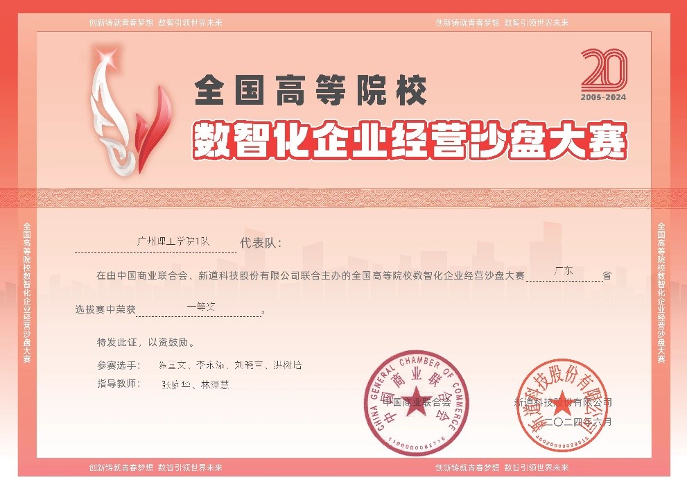 (林蕴慧)6月28-29日,第二十届“新道杯”全国大学生数智化企业经营沙盘大赛广东赛区总决赛在广东理工学院举行。威廉希尔williamhill中文,威廉希尔williamhill中文参赛团队在指导教师张庭华和林蕴慧的带领下,最终取得广东省本科组一等奖的出色成绩。