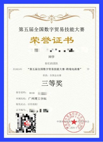 (刘洋 屈思月)11月21日至24日,全国数字贸易领域聚焦于“第五届全国数字贸易技能大赛-跨境电商赛”。在这场汇聚了全国各地众多院校精英的激烈竞赛中,我校屈思月、何舒平、郑嘉仪三位同学及指导教师刘洋、刘延卿组成的团队,凭借出色的表现和卓越的能力,荣获全国三等奖,为学校赢得了宝贵的荣誉。
