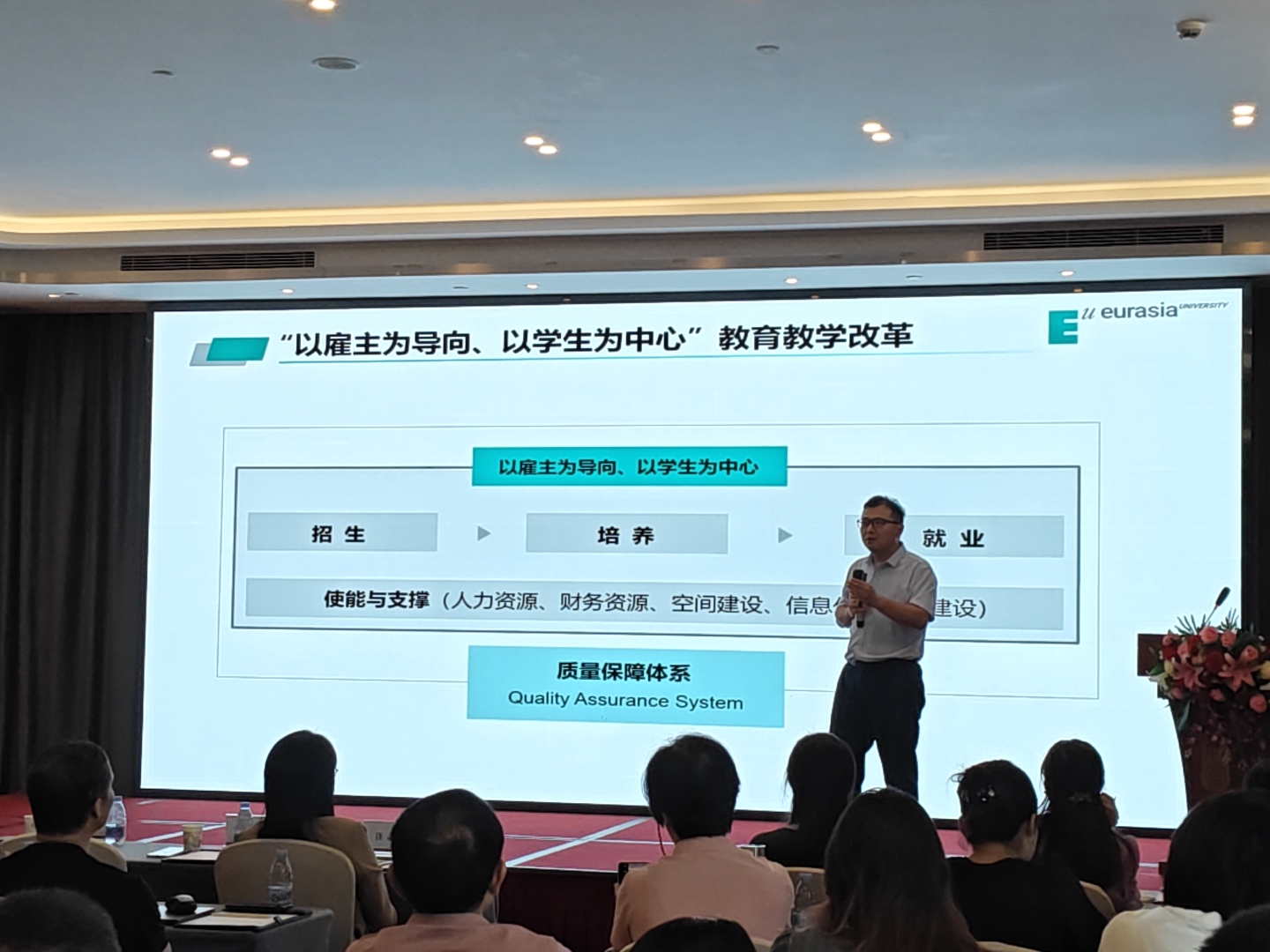 西安欧亚学院威廉希尔williamhill中文副院长以《雇主导向,学生中心(ESC):欧亚工商管理教育创新路径探索》为题作首场主旨报告。他从学院概况、ESC理念落地、人才培养特色及未来展望四个维度,系统阐述了“学生—教师—雇主”三方动态协作的“定制班”模式,为在场教师提供了可复制、可推广的ESC范式。