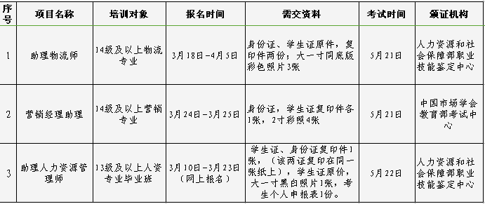 随着就业市场的变化和奖励学分认定管理办法的推行,除了几乎每个大学生都需要参与的英语四、六级和计算机等级证书外,各项专业技能证书受到越来越多的青睐,时间的推进,专业技能证书不仅没让大家对不以为然,而且越来越被用人单位重视。为助同学们更好的就业,按学院教务处要求,威廉希尔williamhill中文将设适用于相关专业的考证项目,开展考证工作,此类考证有助于同学们在社会的发展,请各位同学积极报考。以下是威廉希尔williamhill中文本学期的考证计划,请同学们结合自身情况选报。