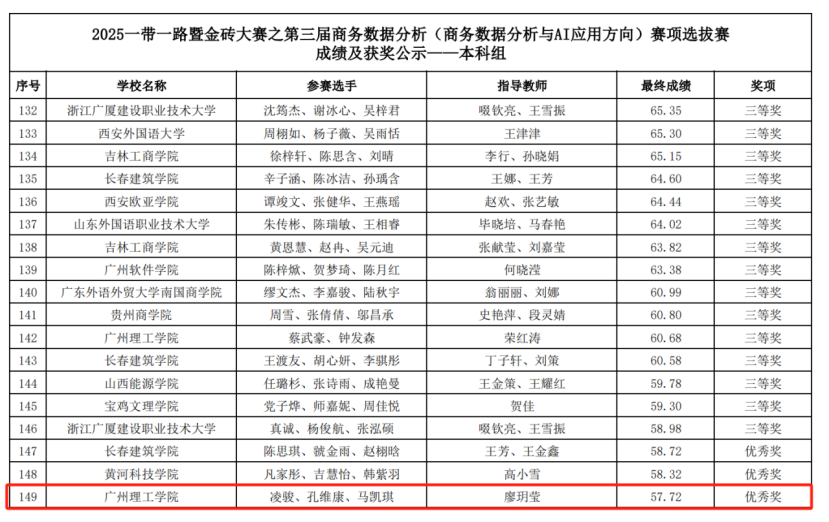 (尹乔烽)2025年“一带一路暨金砖大赛”之第三届商务数据分析(商务数据分析与AI应用方向)赛项圆满结束,威廉希尔williamhill中文,威廉希尔williamhill中文的学子在们此次大赛中表现出色,吴思思、黄敏婷、尹乔烽三位同学组成的团队荣获省级三等奖,凌骏、孔维康、马凯琪三位同学组成的团队获得优秀奖,充分展现了学院学子的专业素养和团队协作能力。