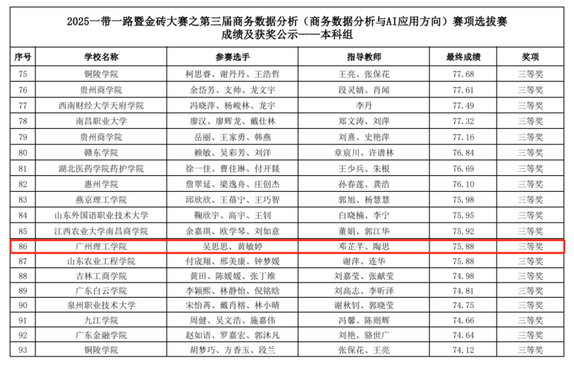 本次大赛吸引了众多高校的优秀学子参与,竞争异常激烈。大赛聚焦商务数据分析与AI应用领域,要求参赛团队在规定时间内完成数据收集、分析、处理以及商业策略制定等一系列任务,旨在培养学生的数据分析能力和商业决策能力。在比赛过程中,吴思思、黄敏婷、尹乔烽三位同学组成的团队凭借扎实的专业知识、熟练的数据分析技能和创新的思维方式,在众多参赛队伍中脱颖而出,最终荣获省级三等奖。凌骏、孔维康、马凯琪三位同学组成的团队也表现出色,凭借出色的数据分析能力和团队协作精神,获得了优秀奖。
