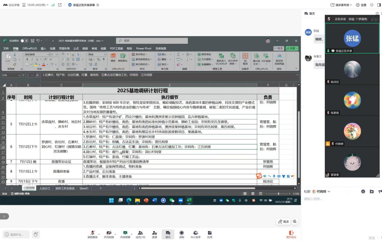 为此次实践调研之旅开展的更加顺利,团队于7月9日晚召开线上会议进行部署规划。张锰老师强调,团队需以“观察者”的敏锐捕捉乡村发展肌理;以“参与者”的热忱助力资源活化,直指“产业振兴、文化振兴”的核心命题;以严谨态度记录乡村故事、创新思维搭建助农桥梁,让青春力量真正扎根乡土、服务民生。肖春兰老师对团队在2023年平远县上举镇、2024年四会市罗源镇打造“特色农产品产销增长+地域文化破圈传播”的成功范例展开深入剖析,汲取宝贵经验,推动模式实现新的升级,并祝愿此次调研活动圆满成功。