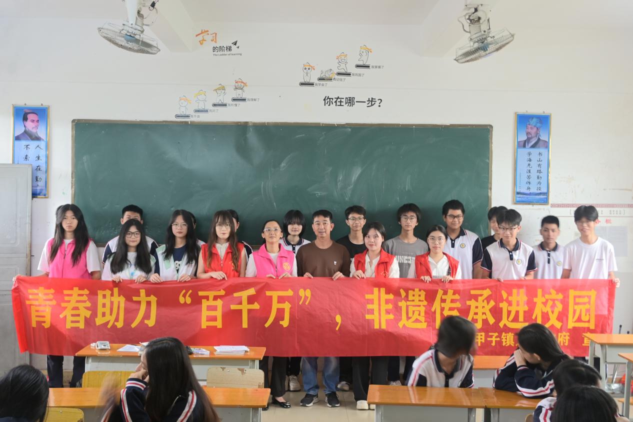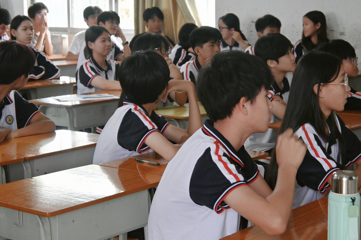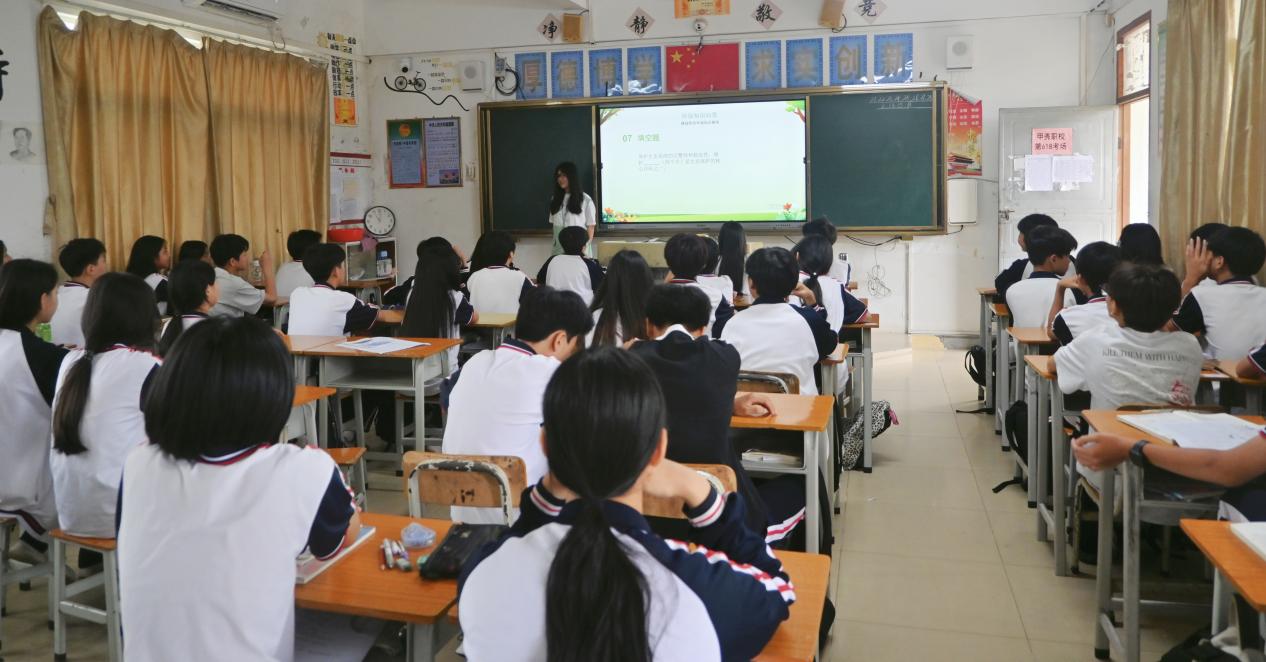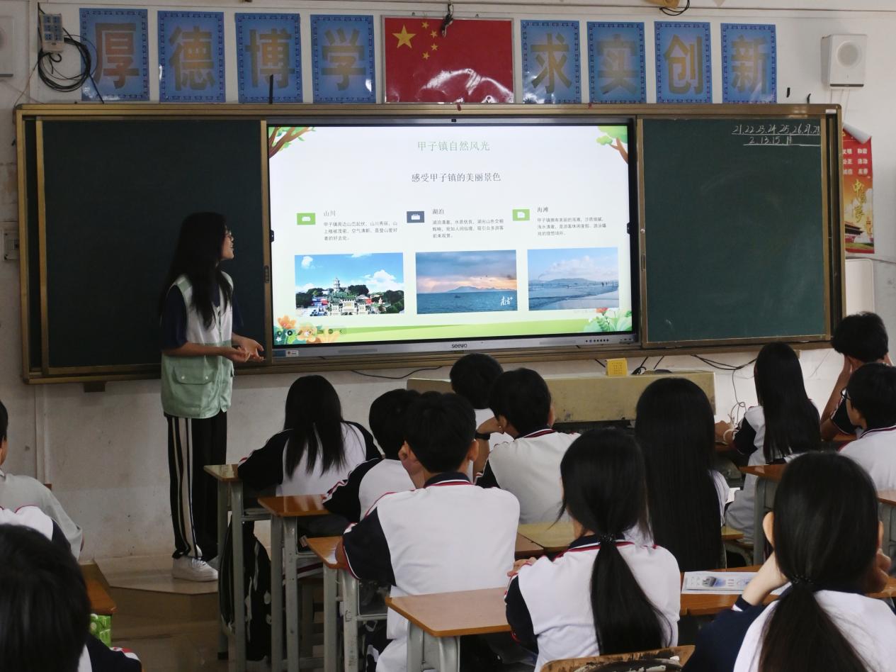 活动伊始,“英韵乡播队” 的队员们通过精心制作的 PPT,向甲秀中学的同学们详细讲解了“绿美广东” 生态建设的内涵与意义。PPT 中,队员们巧妙地将 “绿美广东” 的整体规划与甲子镇的自然风光结合起来。通过对比甲子镇过去和现在的生态环境,同学们深刻感受到了保护环境的重要性,也明白了 “绿美广东” 活动与自己家乡息息相关,是为了让甲子镇的天更蓝、水更清、地更绿。