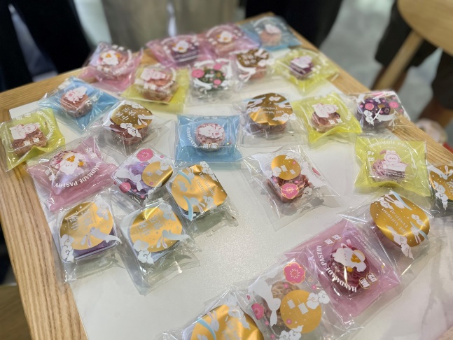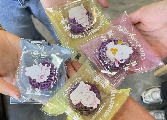基础手法掌握后,创意环节亮点迭出。一组同学将红蓝冰皮叠压,做出“丹霞映碧” 的渐变效果;另有同学用白面团点缀字母,让传统纹样添了时尚感。