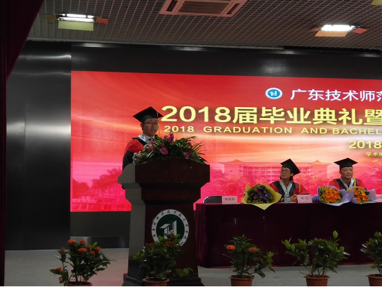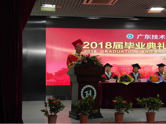 曾建权院长致辞并宣布学校学士授予决定的文件。曾院长对毕业生提出了几点希望:热爱祖国,报效国家;志存高远,努力奋斗;脚踏实地,知行合一;敢于创新,积极进取,祝毕业生前程似锦,事业有成,望常回校看看。