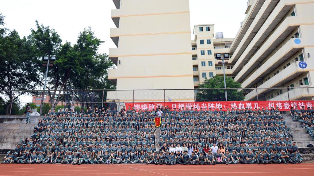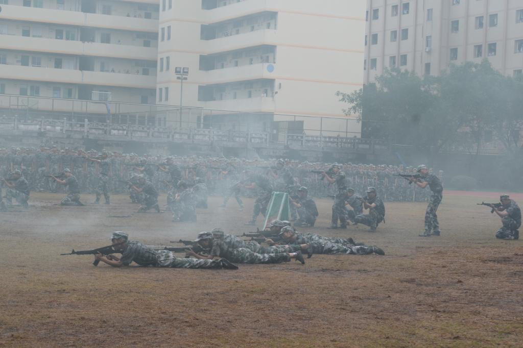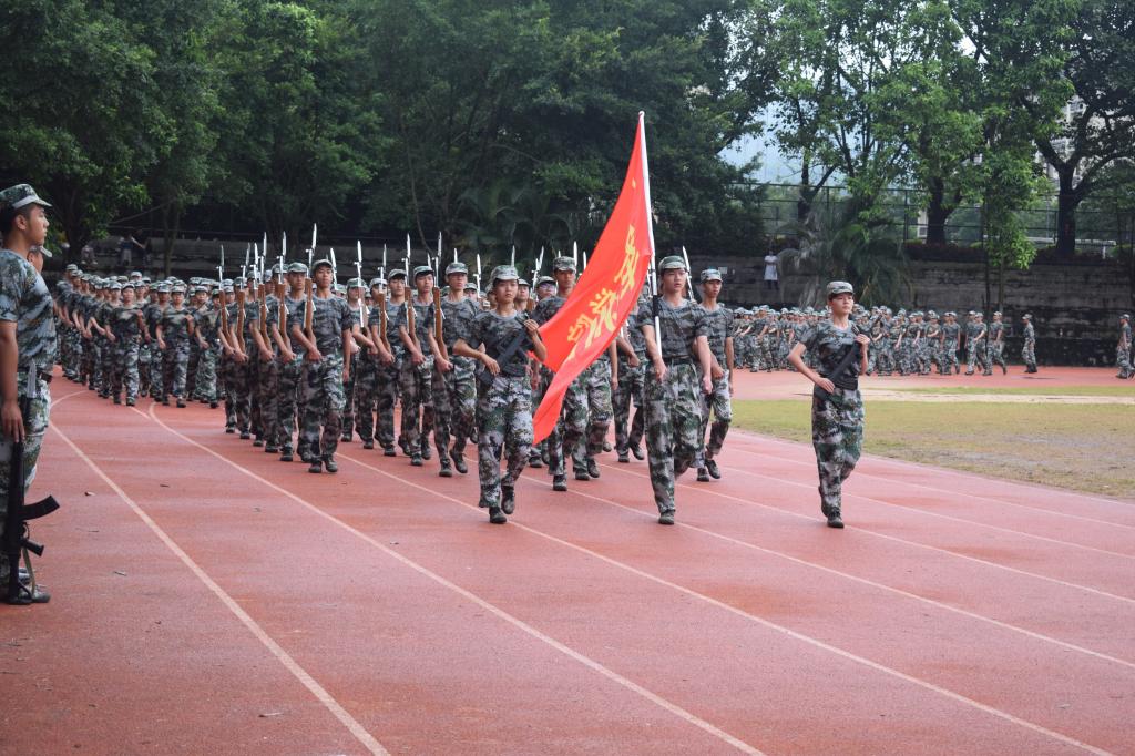 大会伊始,举行升旗仪式,在庄严的国歌声响起,全体起立向国旗行注目礼,全场气氛肃静而严肃,随后校党委书记黄圣诚走向新生方队向同学们问好,同学们则以最高昂的气势回应着,仿佛在向14天的军训生活致敬。期间,伴随着高亢激昂的奏乐,首先迎来的是阅兵方队,各营方队意气风发、斗志昂扬、步伐整齐,依次走过主席台前,他们用威武军姿展示了此次军训的丰硕成果,用铿锵的步伐和嘹亮的口号展现了当代大学生朝气蓬勃的昂扬风貌。军训的表演也让人眼前一亮,军体拳、匕首操、擒敌拳、手语操、刺杀操还有反恐行动,参训“战士们”气宇轩昂、动作有力、招招生威,充分展现出新一代广州理工学子青春飞扬、昂扬向上的精神风貌。