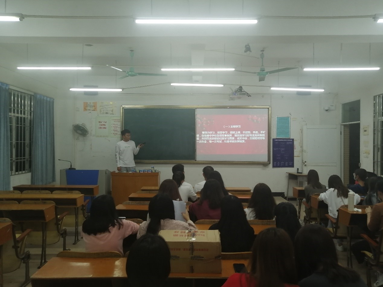各班班导师与辅导员对学习、行为、上网、宿舍、课堂五个方面文明建设做具体举措传达。致力于切实抓牢课堂学习阵地,全力培育优良的学习环境,全面完善学风规章制度,积极营造网络文明新风,杜绝不文明行为的产生。各班在班会中指出学风问题深刻地影响着学生今后的进步和学校未来的发展。同时学风建设是一项系统工程,是系统内外各种要素相互作用的长期积淀,必须坚持内外兼治、综合治理、持之以恒的建设原则,学风才能呈现出新的面貌。