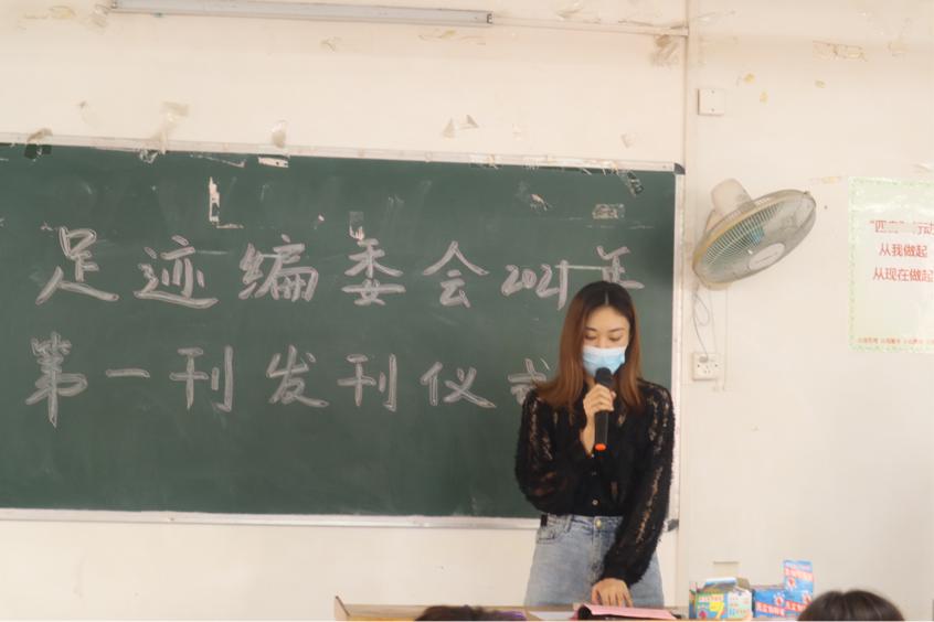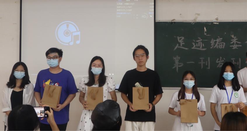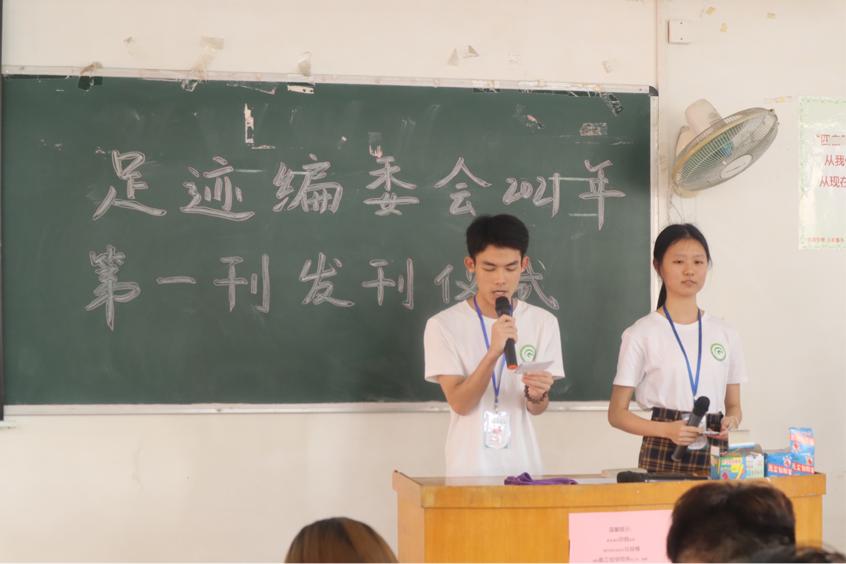 本次仪式由足迹编委会大一干事陈佩华和姚荣键进行主持。发刊仪式分六个环节,第一环节为视频播放,第二环节为杂志介绍,第三环节为颁奖仪式,第四环节为投稿作者发表感言,第五环节为指导老师发言,第六环节为合影留念。