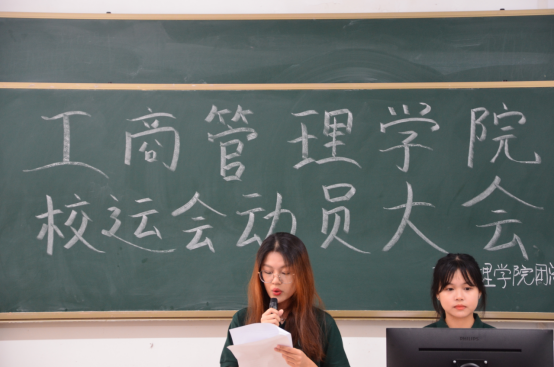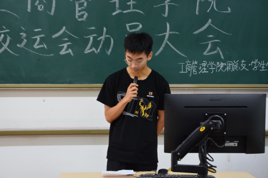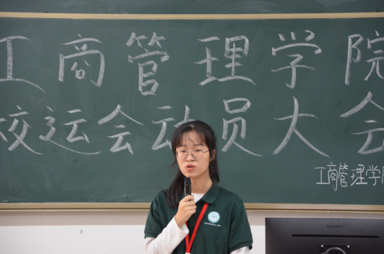 威廉希尔williamhill中文学生会文体艺术部副部陈芷晴发言,介绍赛前运动员注意事项,讲解校运会各项项目的比赛流程与比赛规则。