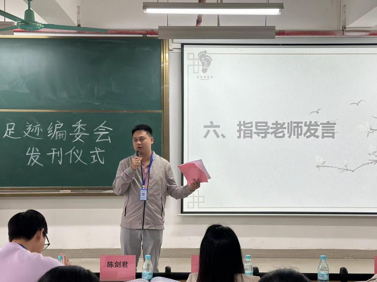 第六项议程,足迹编委会指导老师陈剑君老师进行致辞。他对新一刊杂志的发布表示热烈的祝贺,接着对于校园美好生活建设提出建议,同时对足迹编委会成员作出的贡献表达了由衷地感谢,希望足迹编委会成员能够不忘初心,踏上新征程,再创足迹光辉灿烂的美好明天。