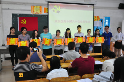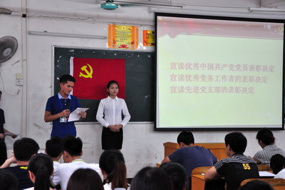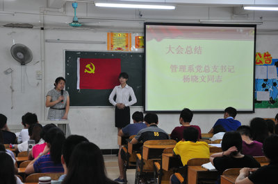 整个会议过程紧凑且庄严。首先,全体党员起立,奏国际歌。紧接着,以黄思敏、朱静欢、劳和勇等同志为代表的支部党员上台发表其在党组织工作这一年来的感想,他们都表示自己在党组织工作受益良多,在学习上、工作上与生活上都取得不同的进步,最后不约而同地表达:十分期待即将成为师兄师姐的角色转换和带领师弟师妹努力为党组织奉献的坚定决心。