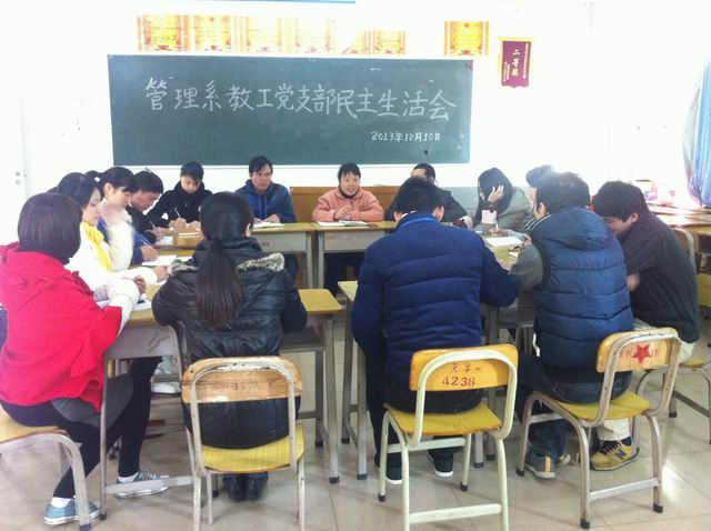 本系讯(通讯员:林成园)12月10日,管理系在六栋309召开了教工党支部民主生活会。本次民主生活会的主题是“贯彻学院文件精神,全面提高教工党员党性修养”,进行了教工党员的批评与自我批评。会议由我系党总支书记杨晓文主持,全体教工党员参加了会议。