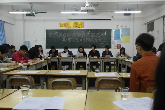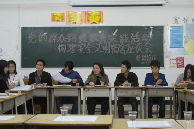 本系讯(通讯员:肖倩影)3月20日晚8点整, 由管理系党总支主办、管理系宿舍委员会承办“党的群众路线教育实践活动:构建安全文明宿舍座谈会”。出席本次座谈会的嘉宾有管理系党总支书记杨晓文,教工党支部书记、办公室主任钟清恒,党总支组织委员秦文飞,党总支宣传委员、系宿委会指导老师林成园,管理系宿舍委员会全体成员及大三各班班委、预备党员。