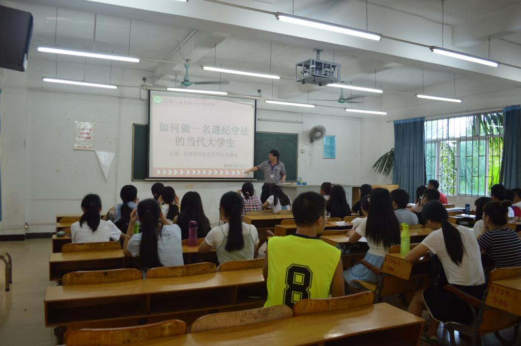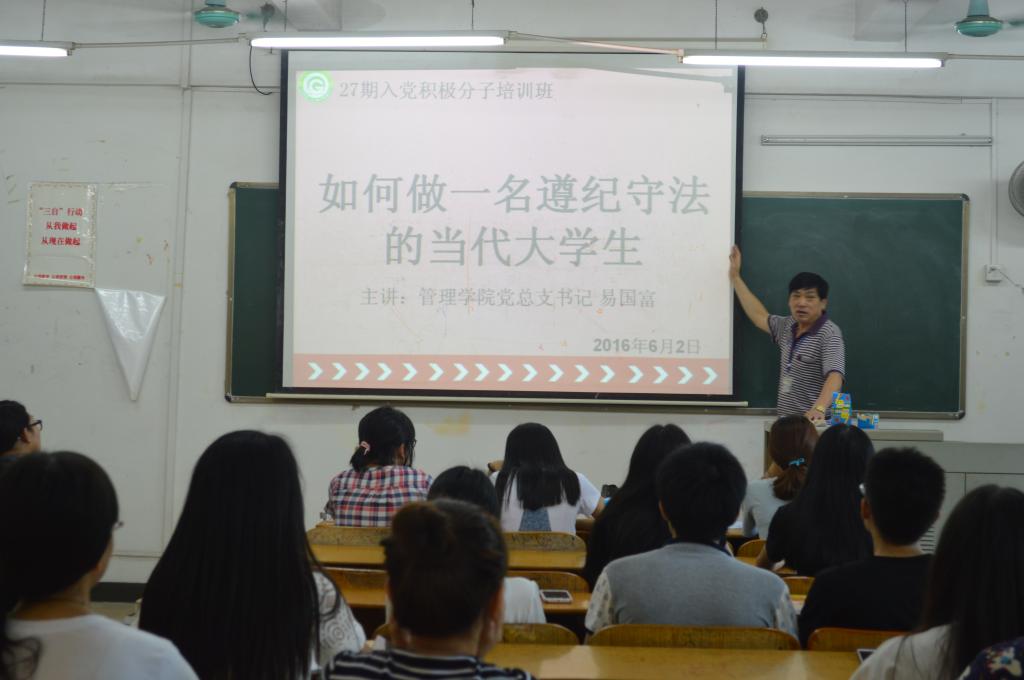 主讲人易国富书记就“如何做一名遵纪守法的当代大学生”这一主题做出深刻阐释。易国富书记从学生自身的校园生活谈起,对如何做一名遵纪守法的当代大学生提出建设性建议。紧接着,易国富书记明确提出,做一名遵纪守法的当代大学生需要从小事做起,从自我做起,养成良好的行为习惯,大学生需要不断规范自己的行为举止,不断修炼好自己的心性,并且指出:做一名合格优秀的大学生不单单指学习成绩优秀,更强调当代大学生需要具备良好的综合素质才算是真正合格的当代大学生!会议最后,易国富书记鼓励第27期入党积极分子从日常生活小事做起,积极做一名遵纪守法的合格大学生并给予了深厚的期望!