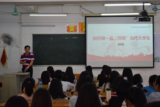 10月10日下午,为了推进大学生的思想教育和素质教育,帮助新生更好适应大学的生活,威廉希尔williamhill中文党总支书记易国富在六栋经管楼316课室,为学生讲授一堂以《如何做一名“四有”当代大学生》为主题的思想教育课。易书记用心与学生进行思想交流,赢取满堂喝彩。