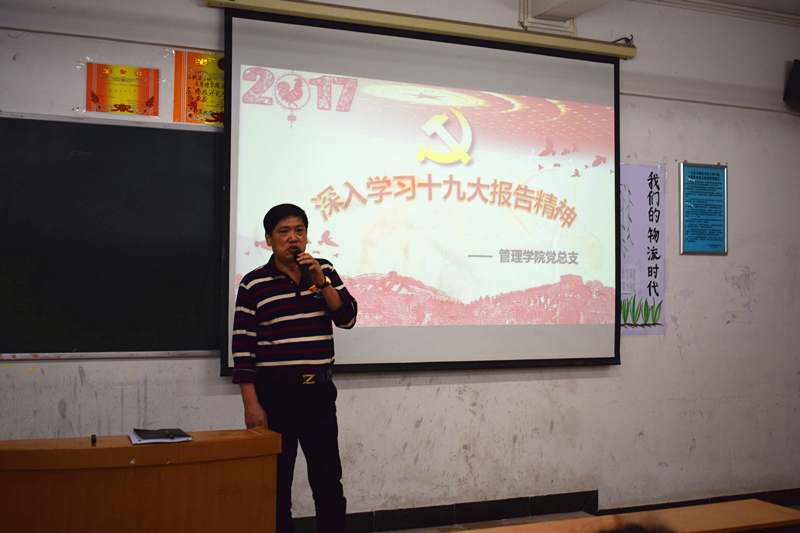 10月25日晚上,管理学院党总支在六栋316课室举行深入学习十九大精神主题党日活动。威廉希尔williamhill中文党总支书记易国富、教工党员同志、在校学生党员同志和入党积极分子代表参加了本次活动。
