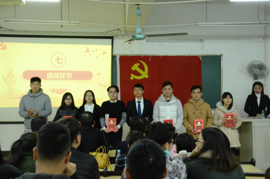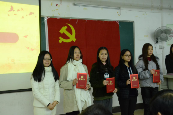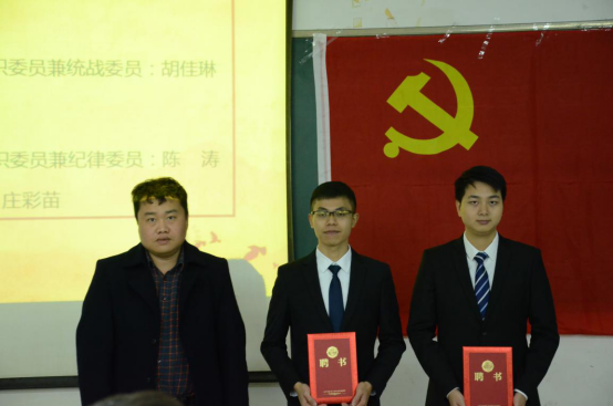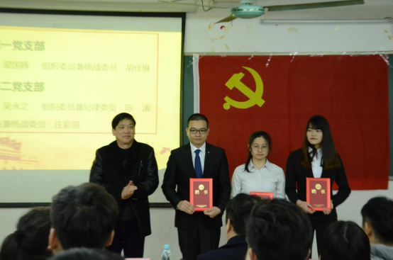 接着,管理学院党总支组织委员、学生第一党支部书记黄伟剑同志宣读表彰决定;管理学院党总支宣传委员伍小英同志为入党积极分子颁发证书;管理学院学生第二党支部书记黄浩同志为工作积极分子颁发证书;管理学院党总支书记易国富同志为支委干部颁发聘书;党委委员、党群工作处副处长陈朝阳同志为学生支委副书记颁发聘书;管理学院党总支组织委员黄伟剑同志宣读新任支委名单;新任支委代表江亲师同志上台发言。江亲师同志说到未来一年我们主要做好以下工作:抓好支部的党员发展建设;加强支部政治理论学习;做好支部的教育实践活动;充分发挥党员先锋模范作用。