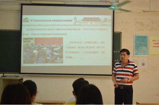 5月2日上午,在五四青年节到来之际,习近平总书记到北京大学考察并发表重要讲话。习近平总书记强调:大学是立德树人、培养人才的地方,是青年人学习知识、增长才干、放飞梦想的地方。广大青年生逢其时,也重任在肩。大学对青年成长成才发挥着重要作用,高校只有抓住培养社会主义建设者和接班人这个根本才能办好,才能办出中国特色世界一流大学。习总书记强调高校办学的三项基础性工作,并对广大青年提出了四点希望。易国富解读了习总书记对广大青年所提出的四点要求:执着的信念、优良的品德、丰富的知识和过硬的本领。要求全体学生党员同志要在心理、意识、行动上做到高度一致,坚定于信念,执着于理想、不该仅满足于碎片化、无逻辑性的信息,应追求有条理的信息,且做到温故而知新、应该端正自身态度,把储备好的知识做到最大的能量释放,为社会作出应有的贡献。