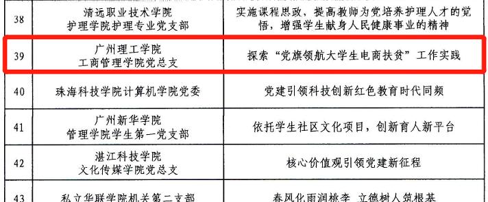 2021年6月10日,广东省委教育工委评选出了2021年度全省高校基层党建工作创新案例,我校威廉希尔williamhill中文党总支申报的案例《探索“党旗领航大学生电商扶贫”工作实践》荣获优秀奖。