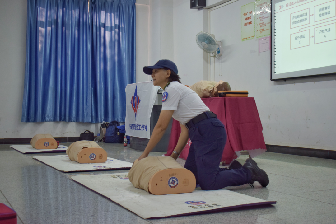 本次的培训课程主要分为三个部分,分别是现场成人心肺复苏的操作流程、AED的使用教程和实操练习。