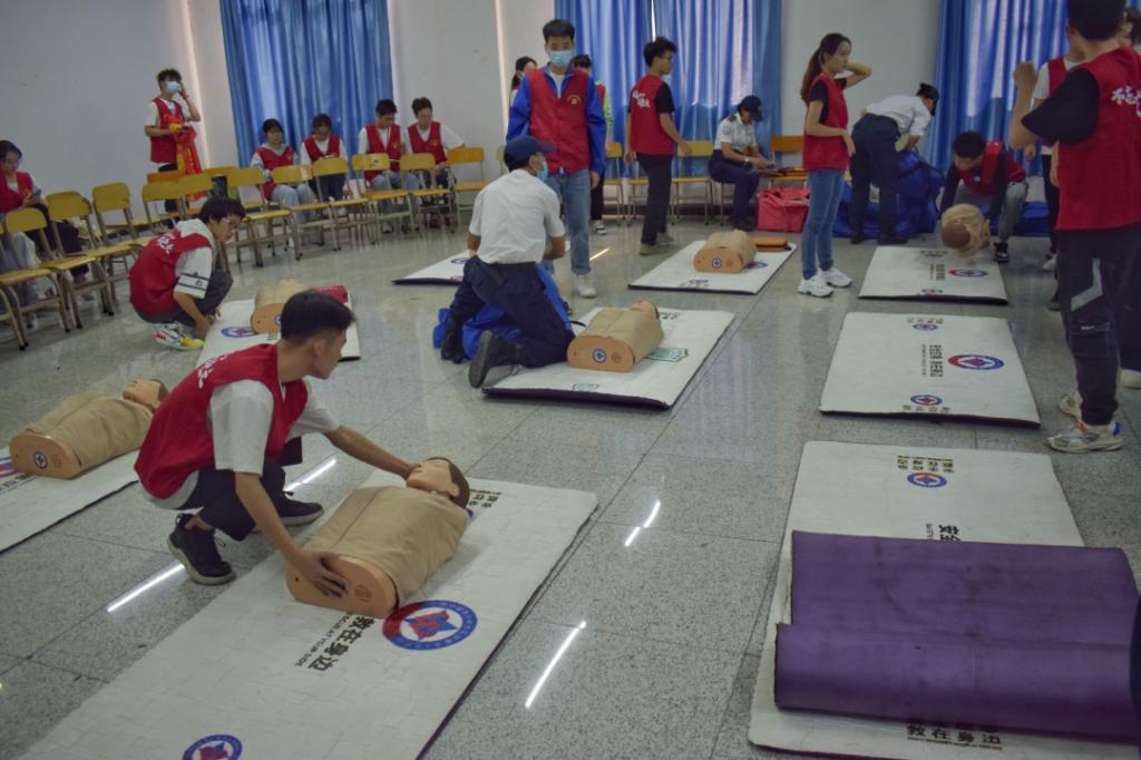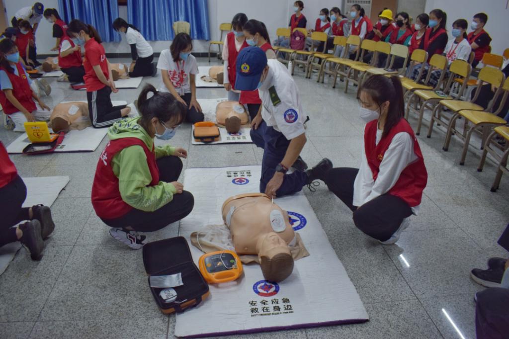 同学们认真听解后,并在吴少冰等老师一对一地指导下使用模拟人、AED除颤仪等教具进行实操。