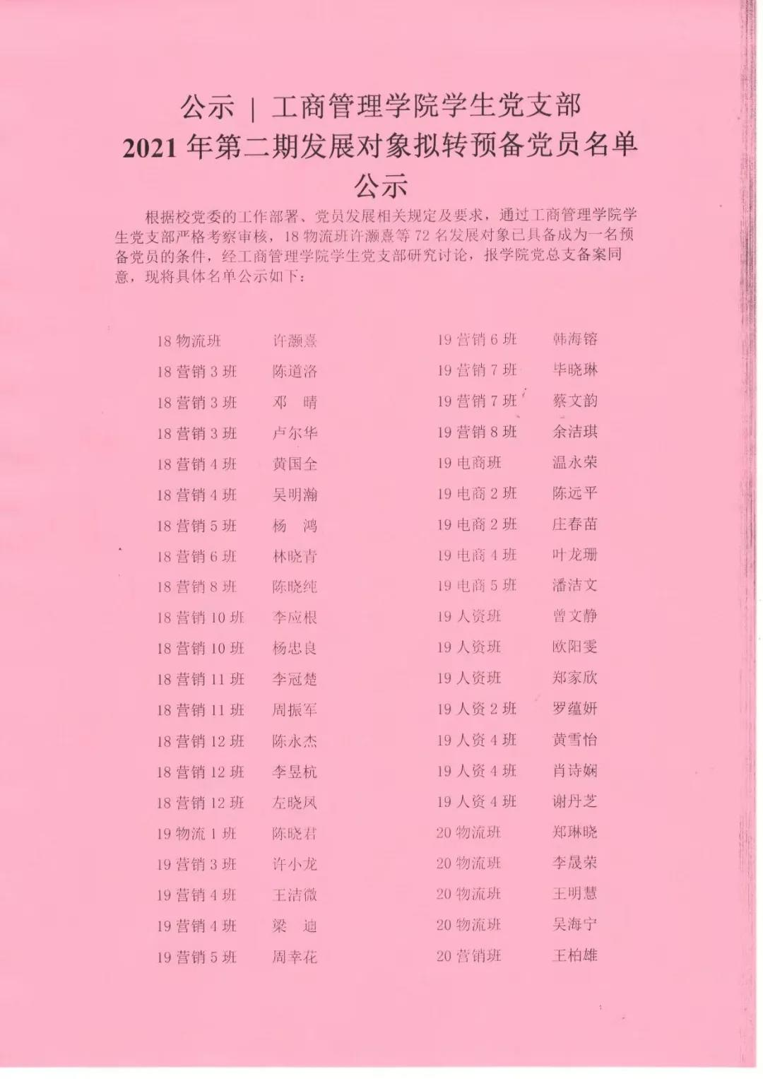 根据校党委的工作部署、党员发展相关规定及要求,通过威廉希尔williamhill中文学生党支部严格考察审核,18物流班许灏熹等72名发展对象已具备成为一名预备党员的条件,经威廉希尔williamhill中文学生党支部研究讨论,报学院党总支备案同意,现将具体名单公示如下: