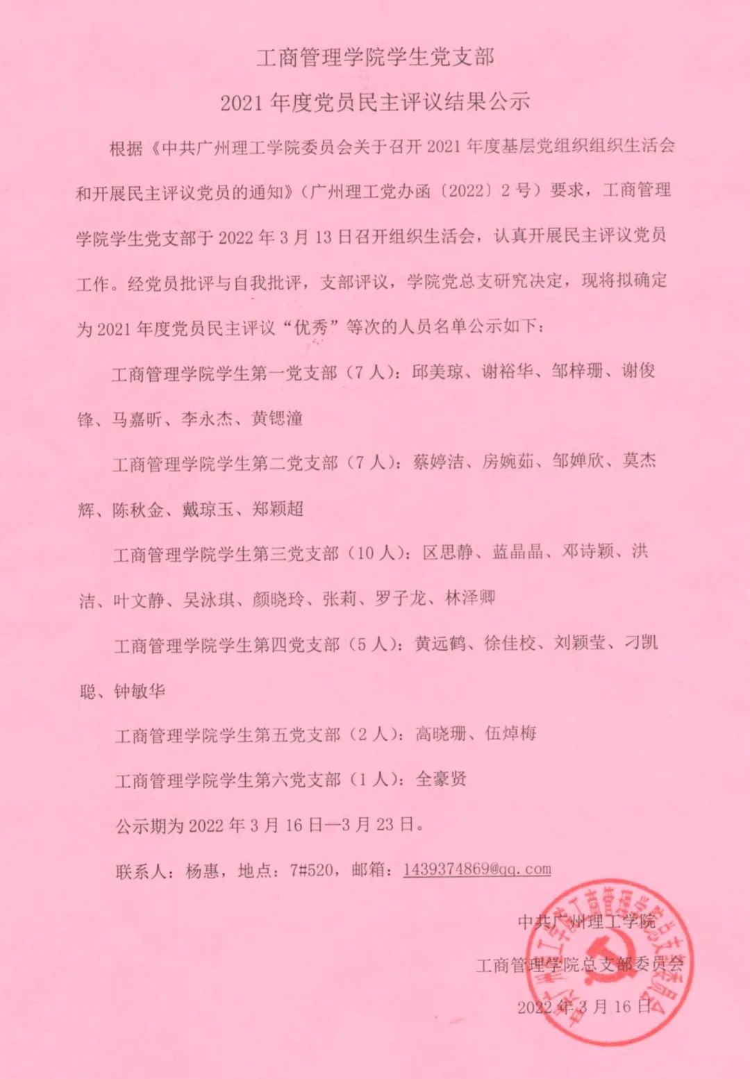 公示期为2022年3月16日—3月23日。如对公示结果有异议,请于公示期内到杨惠书记处反映,办公地点:7#520。