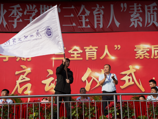 接着大会进行了帽峰山活动的授旗仪式,由22电气7班的潘俊樾同学上台接旗,党委副书记、副校长张志红奏请,标志着帽峰山活动的正式启动。