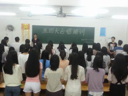 本系讯(通讯员:岑晓雯)2014年4月期间,我系在6栋510课室进行 “五四大合唱”比赛的训练。此次五四大合唱的主题是“弘扬五四精神,放飞时代梦想”,必选歌曲是《红旗飘飘》,自选歌曲是《打起手鼓唱起歌》。
