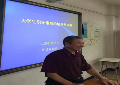 曾教授劝勉学生要树立正确的学习观与就业观,要充分利用大学四年的时间培养良好的政治素质、知识素质、智力素质、心理素质、身体素质;树立崇高的理想和远大的志向,不忘初心、牢记使命,为中国人民谋幸福,为中华民族谋复兴。要具有强烈的事业心和责任感,有诚实守信、谦虚谨慎、不骄不躁的道德品质,有团结合作、开拓创新和勤奋的精神。要制定职业生涯规划,加强职业道德的培养,加强职业能力的培养;在实践中培养提高职业素质,提升自身各方面的素质和能力,增强就业竞争力。
