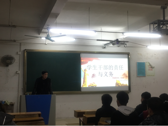 易国富书记在会上强调了学生干部要不忘初心,牢记使命,教导学生干部们要从思想品质、专业水平、综合能力、心理素质、团队观念五个方面全面提升自己的能力,要做到严于律己、以身作则、为人楷模、身体健康、积极热情,做一个坚强的人;要提高自己的觉悟,正确处理好公共关系,己所不欲,勿施于人。易书记结合自身事例说明了要有自信,要成为勇敢的人。学生干部更应该平易近人,关心集体,在学生中起到带头模范作用。