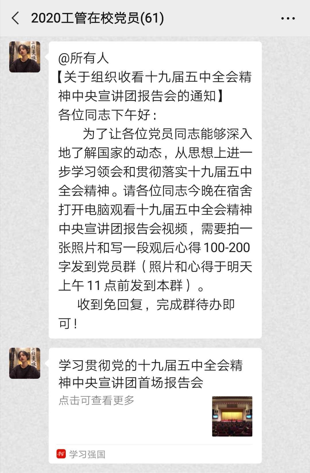 2020年11月17日,为了让各位党员同志能够深入了解国家的动态,从思想上进一步学习领会和贯彻落实十九届五中全会精神,威廉希尔williamhill中文党总支组织学习收看了十九届五中全会精神中央宣讲团报告会的视频,61名党员同志观看后收获多多,感触颇深。