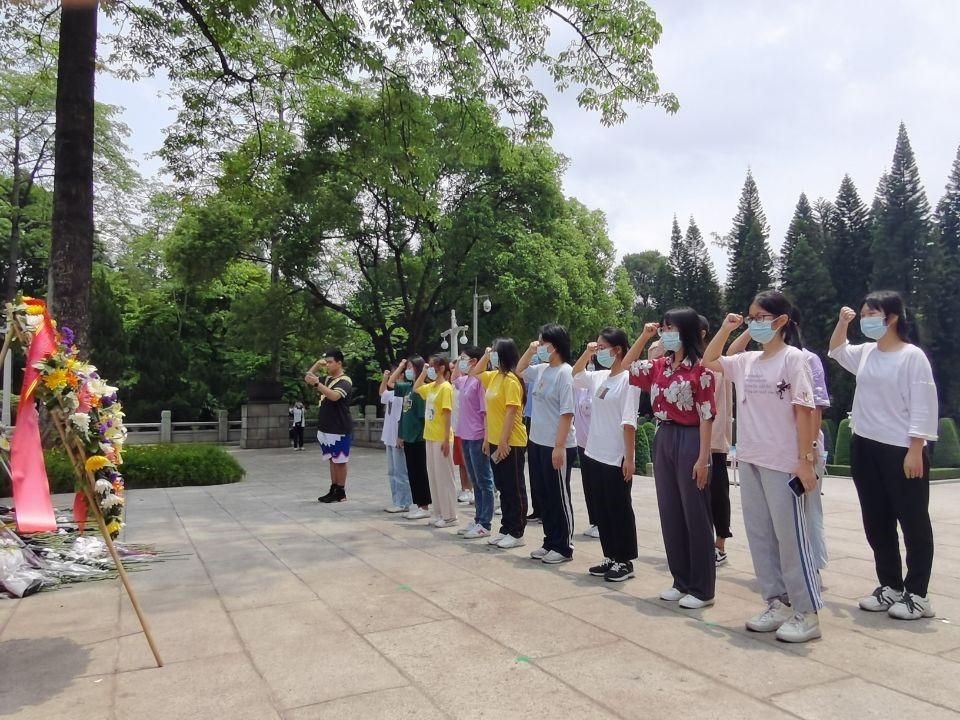 离开博物馆后,同学们前往纪念碑前悼念烈士。纪念碑上赫然写着十个大字:“广州起义烈士永垂不朽”。同学们在这座纪念碑前愈发严肃起来。在李晟荣的带领下,大家在纪念碑前默哀三分钟。在默哀时,仿佛还可以听到那一声声炮响、战士们冲锋的号角,可以感受到战士们为人民无畏奋战到最后一口气的决心。结束默哀后,同学们重温入团誓词,向逝去的烈士们表明自己为国、为党、为人民奉献的决心。