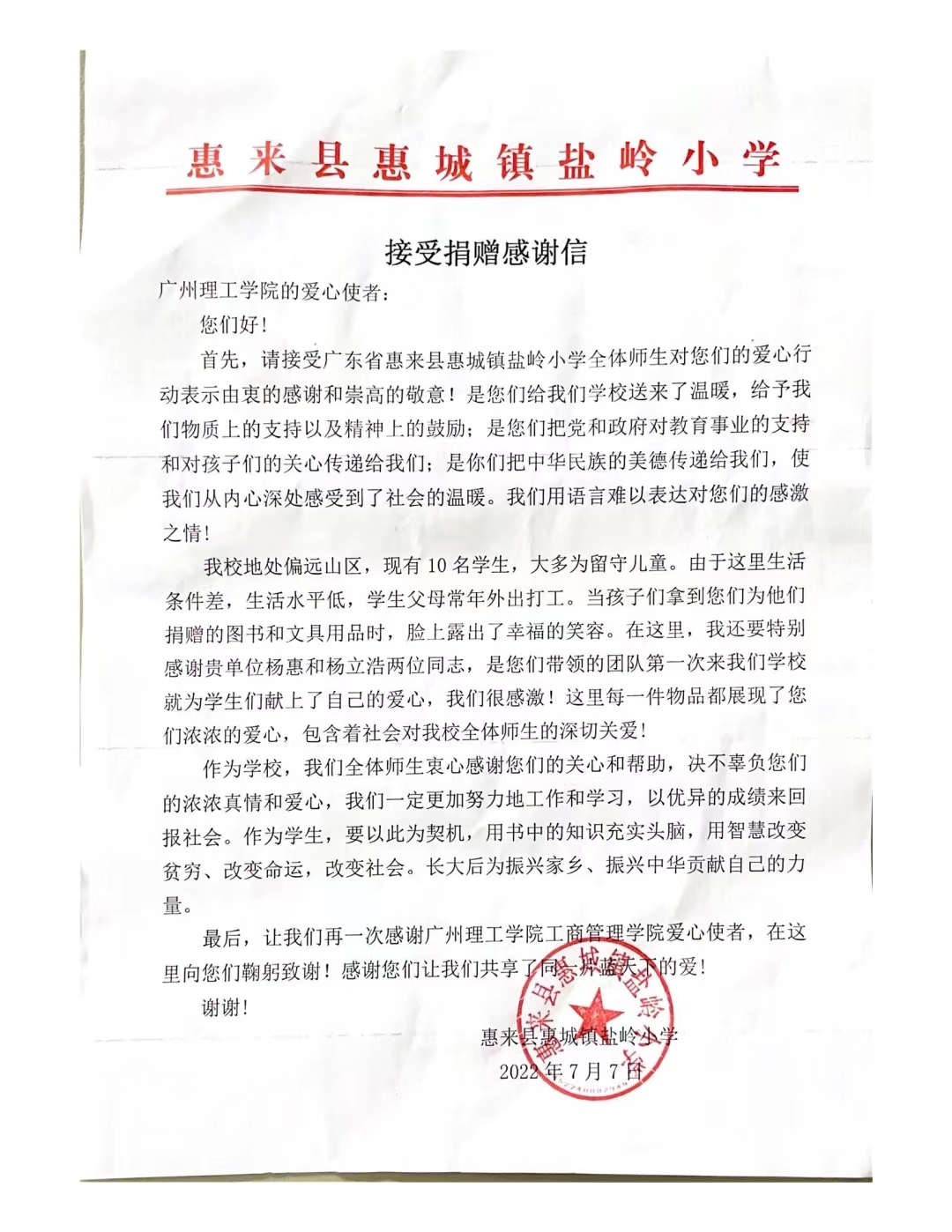 盐岭小学接受捐赠感谢信