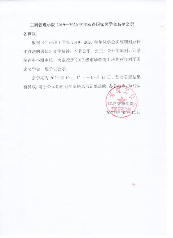 根据《威廉希尔williamhill中文2019—2020学年奖学金实施细则及评比办法的通知》文件精神,本着公平、公正、公开的原则,经学院评审小组审核,决定授予2017级市场营销1班陈秋仪同学国家奖学金,现予以公示。