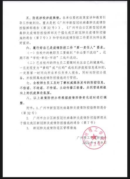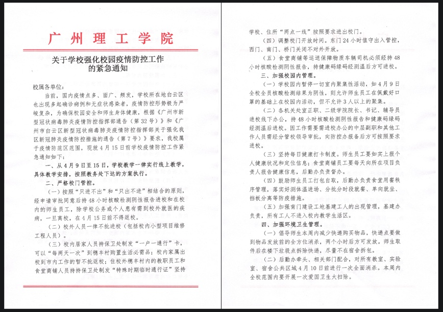 当前,国内疫情点多、面广、频发,学校所处地白云区也出现多起确诊病例和无症状感染者,疫情防控形势极为严峻复杂,为确保校园安全和师生身体健康,根据《广州市新型冠状病毒肺炎防控指挥部通告(第32号)》和《广州市白云区新型冠状病毒肺炎疫情防控指挥部关于强化我区新冠肺炎疫情防控措施的通告(第7号)》要求,我校属于疫情防控区范围。为强化校园疫情防控工作,我校做出了如下的紧急措施: