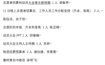 迎新工作组成员:罗雅淇、谭桃一、文家俊、温永荣、邹怡清、张小璇、邱雅楠、苏妍、余子欣、李菁菁、谢怡捷、陈钰洁、陈芷晴、梁敏亭、梁明飞。该策划组成员分工明确、认真负责,他们打通策划中的各个节点,衔接好各部分工作,力求做到最好。