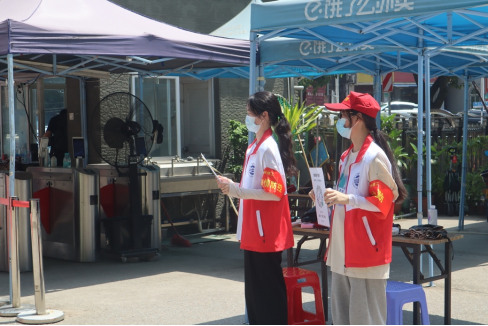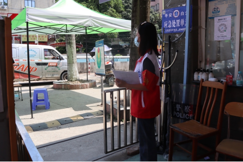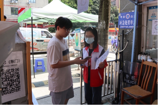 学生党员在校门口维持进出校园秩序(鄢璐摄)