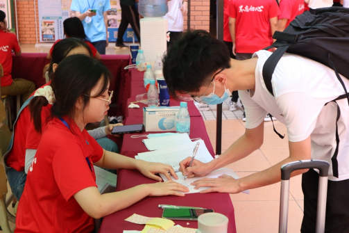 学生党员在报到处为新生答疑解惑(李鸿杰摄)